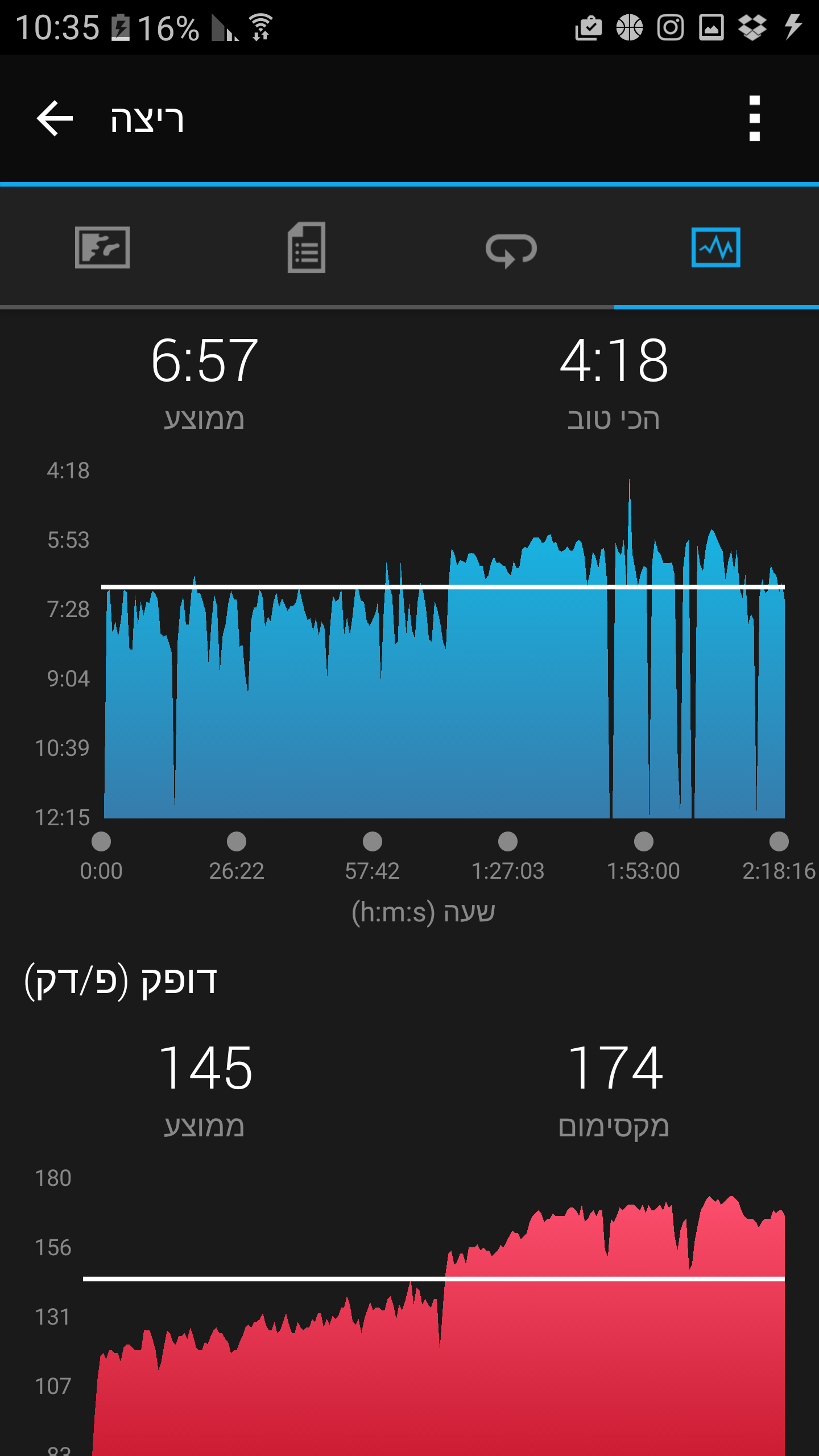 את הראשונים רצתי בשלווה ובנחת עם מיה וארנון, עם דופק שהגיע ל-130 רק לעתים רחוקות. זה לקח שעה ורבע והיה כיף גדול. את העשירייה השנייה רצתי לבד, בדופק שנע בדרך כלל בין 165 ל-170. עוד לא עשיתי בדיקות מקצועיות, אבל אני מעריך שהרמה הזו מייצגת 85-90 אחוז מהקצב המקסימלי שלי. אני יכול לרוץ בדופק 180-185 חמישה ק"מ. יכול להיות שגם עשרה. ואולי אני יכול לרוץ בדופק גבוה אפילו יותר. עוד לא באמת הגעתי לשם.