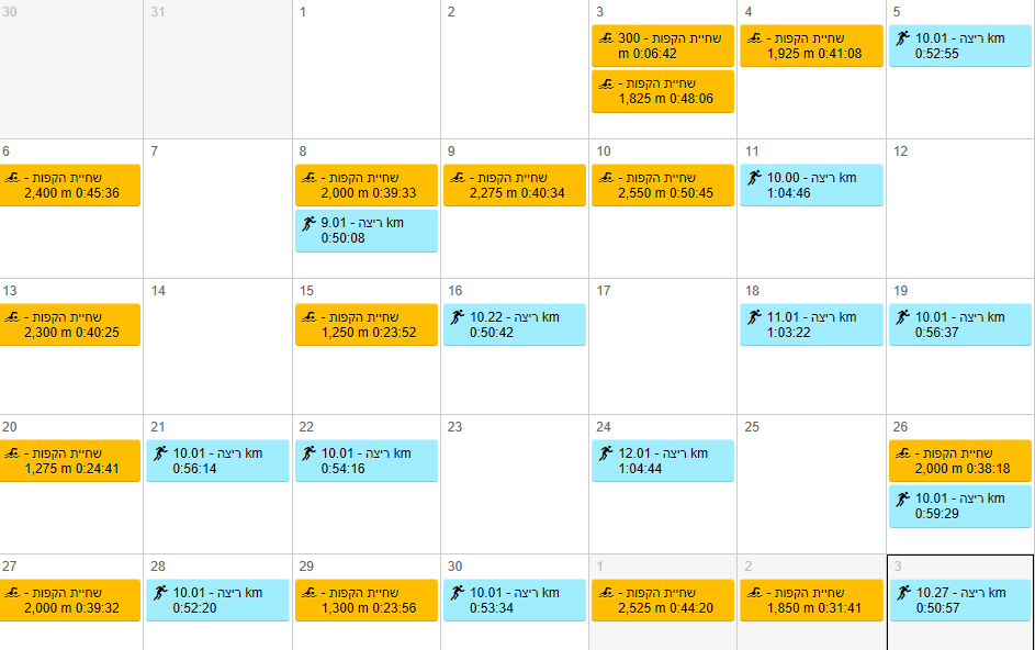 אני יודע שאני רוצה לשחות לפחות ארבע פעמים בשבוע. זה החלק הפשוט, במיוחד כשלא רצים. יש לי שישה או שבעה אימונים בקבוצה לבחור מהם, ואם אני לא מספיק, אז אני משלים לבד באימוני נפח. זה קל. עם זה אני מסתדר.